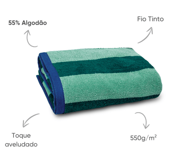 A Toalha Beach Turqueza, oferece um toque irresistivelmente macio e aconchegante, ideal para quem busca conforto e estilo na hora de aproveitar a praia. Confeccionada com uma combinação de 55% algodão e 45% poliéster, ela proporciona uma sensação aveludada única, garantindo alta absorção e suavidade. Com uma gramatura de 550g/m², a toalha tem a espessura perfeita para um toque mais denso e confortável. Seu design com listras elegantes, aliado ao fio tinto, assegura durabilidade e cores vibrantes por muito mais tempo. No tamanho 80cm x 1,50m, é ideal para seu momento de relaxamento à beira-mar ou à beira da piscina.